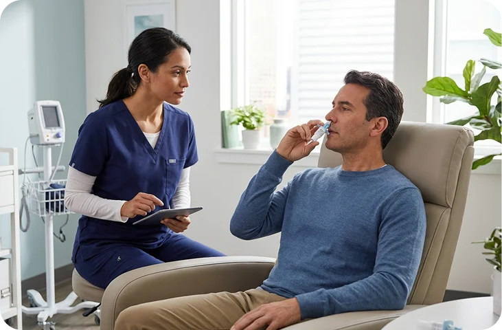 [FDA-approved intranasal treatment covered by most insurance providers.]